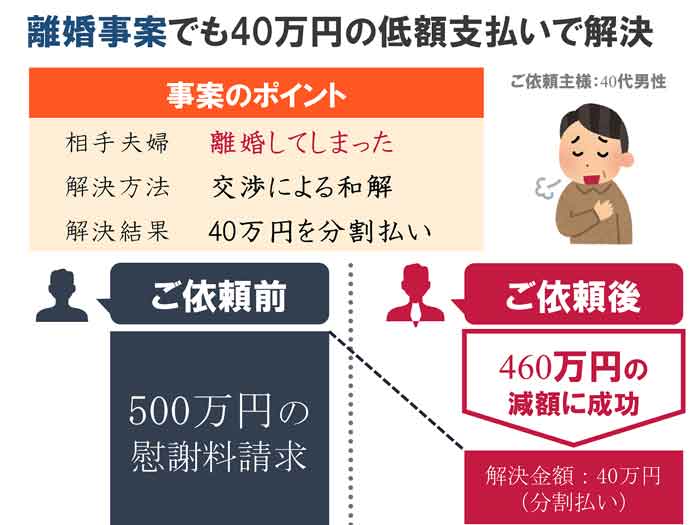 - 相手夫婦が離婚した事案:慰謝料500万円→40万円へ