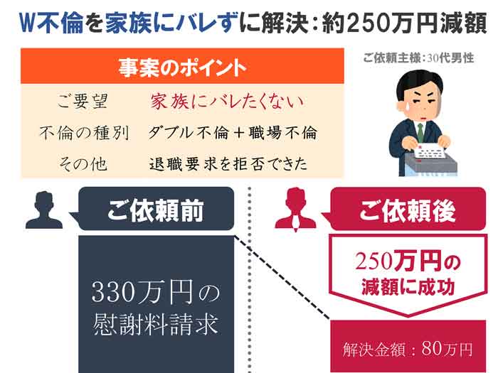 - ダブル不倫をバレずに解決:慰謝料も330万円→約80万円へ