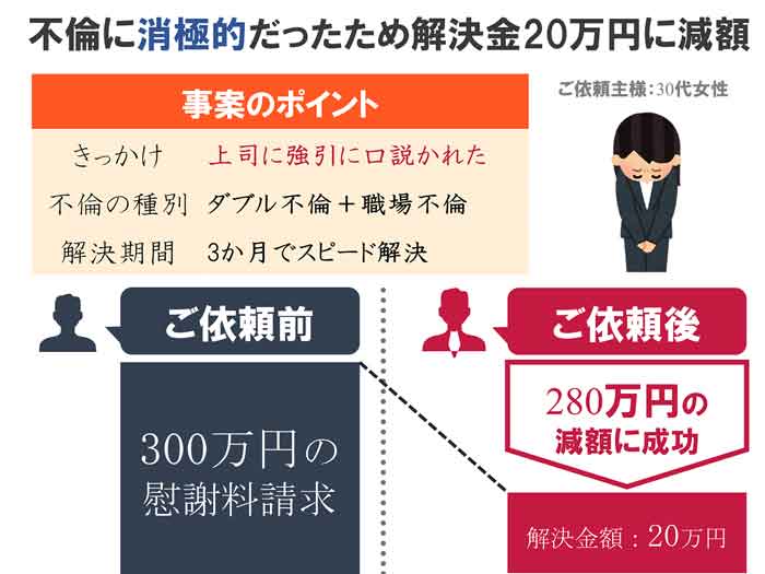 - 職場上司と不倫をした事案:約3か月で20万円の支払いで解決