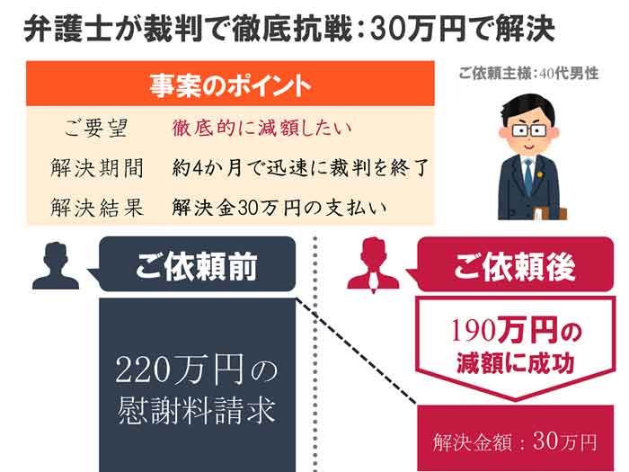 - 裁判対応を行った事案:徹底抗戦で慰謝料220万円→30万円へ
