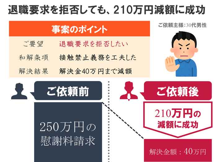 - 退職を要求された事案:退職せずに慰謝料250万円→210万円