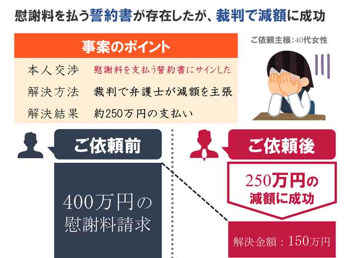 - 本人交渉で誓約書を作った事案:慰謝料400万円→250万円へ